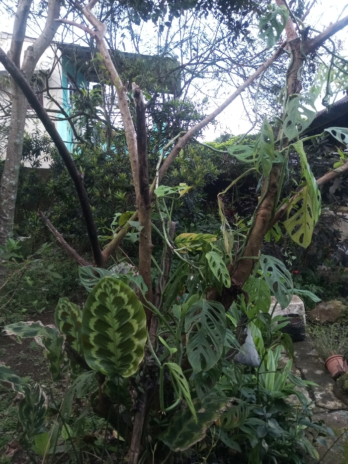This image depicts a lush, overgrown garden environment in Balapur, India. The foreground and midground are dominated by dense vegetation, featuring several prominent plants. Centrally, multiple bare, light-brown tree branches or trunks provide support for climbing plants. A *Monstera adansonii* (Swiss cheese plant) with numerous green leaves, characterized by oval perforations, is actively climbing on the rightmost central branch. To the lower left, a *Calathea makoyana* (Peacock plant) displays its distinct large, ovate leaves with dark green ovals and lighter green patterned bands. Various other green foliage, including shrubs and smaller plants, fills the scene. The ground is visible in areas, appearing as dark soil with scattered rocks and some lighter-colored stone paving in the lower right, where a small terracotta pot is also present. In the background, partially obscured by the dense greenery and bare tree branches, a light-colored building with a distinct turquoise or light blue section is visible under an overcast or light sky. No people or animals are present in the scene.