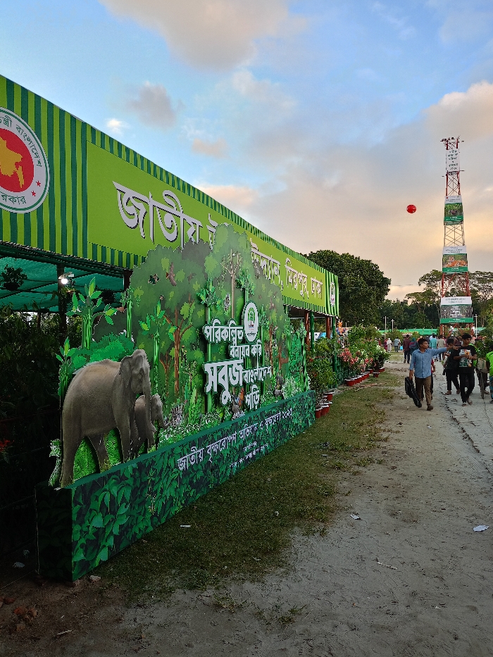 n outdoor display with a green and white sign in Bengali, possibly for a forestry event in Bangladesh