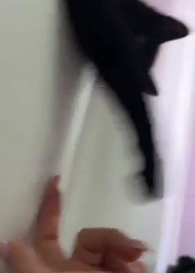 black cat hanging its paw down towards a person's hand. The cat is resting on a white surface and the background includes a lavender colored wall. The person's hand is reaching up towards the cat's paw. The hand appears to have light pink painted nails.