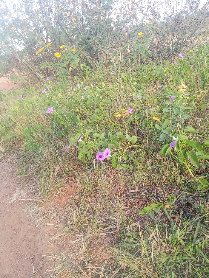 A vibrant display of nature unfolds with a profusion of green foliage and tall grass, interspersed with purple and yellow flowers. A dirt path edges the scene, suggesting a natural walkway. The flora grows abundantly, creating a dense, textured landscape under a bright sky, with a sense of untamed beauty.