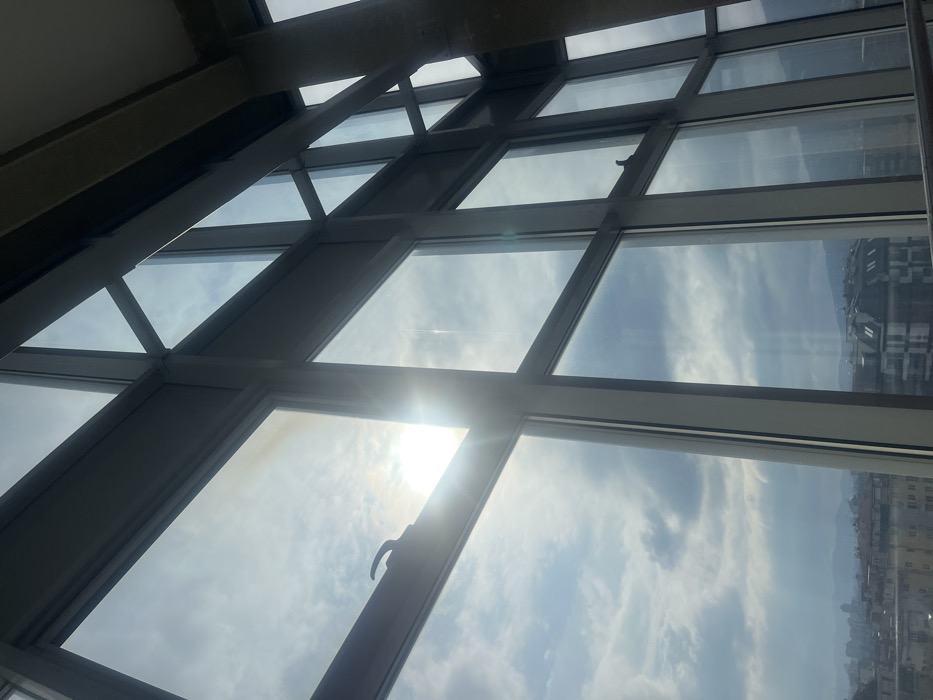 The image displays an exterior view of the city of Sofia, Bulgaria, observed through a multi-pane window system from within a building. The dominant feature is a large, grid-patterned window wall composed of numerous rectangular glass panes set within light-colored frames. In the upper-left portion of the image, the sun is directly visible, creating a strong overexposure, glare, and lens flare across the adjacent glass panes. An L-shaped window latch or handle is present on a horizontal frame in the upper-left quadrant. Beyond the window, the sky exhibits scattered white and grey clouds. Below the horizon line defined by the window structure, an urban cityscape unfolds, revealing a dense array of buildings with varied architectural styles. A building with a distinct dark, sloped roof is visible towards the bottom-center. In the distant background, a range of mountains is visible, characterized by undulating silhouettes. No individuals or specific actions are discernible. The scene is illuminated by bright natural daylight.