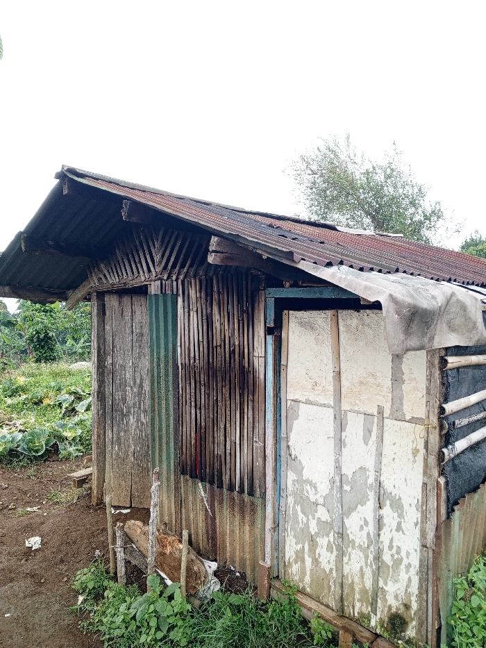 A dilapidated shack, built from corrugated metal, bamboo, and wood, stands in a rural setting. The roof is rusted and sagging. Patches of faded paint and peeling surfaces cover the walls. The structure appears makeshift, possibly improvised from available materials. A small garden patch is visible in the foreground, hinting at a subsistence existence. The sky is overcast, casting a flat light on the scene.