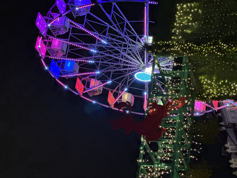 A Ferris wheel brightly illuminated with colorful lights dominates the frame against a dark sky. The wheel features varying colors of pink, purple, and blue, highlighting its structure and carriages. To the right, a structure adorned with twinkling fairy lights adds a festive touch. A red decorative element, possibly a holiday ornament, is prominently displayed in the foreground, partially obscuring the supporting structure.