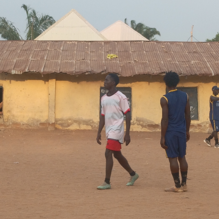 The image displays an outdoor scene in Akwanga, Nigeria, featuring three dark-skinned males on a reddish-brown dirt ground. In the mid-ground, a male walks from left to right, wearing a light-colored t-shirt with red trim on the collar and sleeves, red shorts beneath the t-shirt, and light green athletic shoes. His gaze is directed towards the right. To his right, a second male stands with his back to the viewer, wearing a dark blue sleeveless top with yellow trim and dark blue shorts. His hair is dark and curly. Further to the right, a third male is partially visible, also in a dark blue athletic top and shorts, and wearing a baseball cap, moving away from the viewer. The background features a single-story building with faded yellow or light brown walls and multiple dark, rectangular window openings. The building is topped with a heavily rusted, corrugated metal roof, on which a yellow cloth is visible. Behind this building, two lighter-colored, pyramidal-roofed structures are discernable, along with the tops of palm trees against a pale, overcast sky.