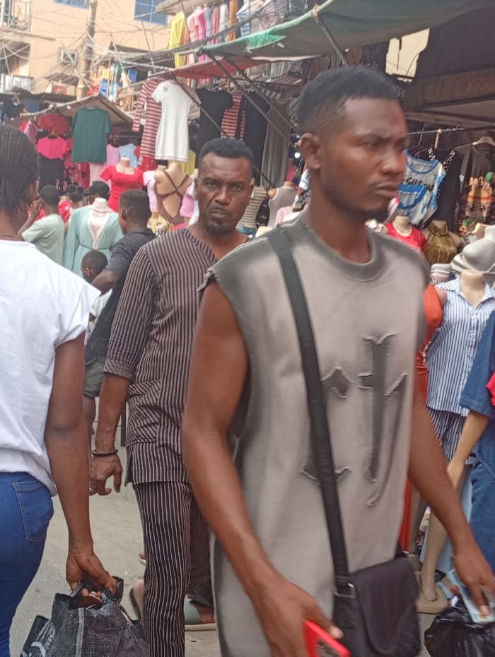 The image depicts a bustling outdoor market scene in Nkwelle, Nigeria. In the immediate foreground, a dark-skinned male with a dark fade haircut wears a grey sleeveless top featuring a dark stylized emblem, and a black cross-body bag. He holds a red smartphone in his right hand and is oriented towards the right edge of the frame. To his left and slightly behind, another dark-skinned male with a short beard and mustache wears a brown and black vertically striped two-piece garment. He looks directly at the camera with a neutral expression. On the far left, the back of an individual wearing a white t-shirt and blue jeans is visible, carrying a black reusable shopping bag with a white graphic. The background is filled with numerous market stalls under green and red tarp canopies, displaying a variety of clothing items on hangers and headless mannequins, including dresses, shirts, and lingerie. Other individuals are visible moving through the crowded market space. Overhead, a tangle of electrical or communication wires crisscrosses against the light brown façade of distant buildings. The ground appears to be a well-trodden, uneven surface.