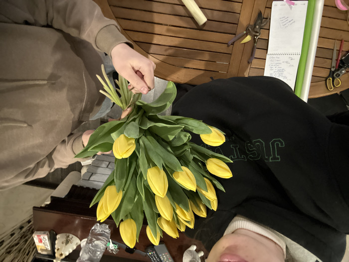 - "The image captures an indoor scene in what is identified as Slavyansk-na-Kubani, Russia, focusing on a bouquet of yellow tulips and two partially visible individuals" by FM-m4hP43, licensed under CC BY 4.0