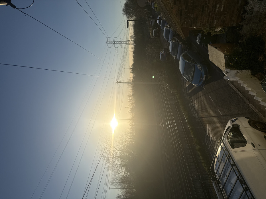The image captures an elevated view of an urban landscape during either sunrise or sunset, looking generally eastward from a residential area in St Denys, Southampton, United Kingdom. The upper portion of the frame features a clear, pale blue sky with a prominent, bright sun positioned in the upper-center left, creating a significant lens flare and backlighting effect. Numerous thin overhead power lines and communication cables crisscross the sky. A large, lattice-structured electrical transmission pylon stands in the distant midground, to the right of the sun's glare. The midground is dominated by a multi-track railway line, featuring at least four parallel tracks running horizontally across the left side of the frame. A security fence separates the railway from an adjacent road. Beyond the tracks, a dense line of bare deciduous trees and shrubs is silhouetted against the bright sun. A utility pole with multiple attached cables is visible between the railway and the street. In the foreground and extending into the midground on the right, a residential street, likely Northam Road, is visible. The street surface is dark asphalt, illuminated by the low sun angle, which casts long, distinct parallel shadows across it. A white commercial van with a roof rack is parked on the left side of the street, partially in shadow. Further along the street, a dark blue hatchback car (with registration WG59 KSS) is prominently parked, facing towards the viewer. A line of other parked vehicles extends down the street into the distance. On the immediate right, a section of a low, white, scalloped wall or fence from a residential property is visible, with dark foliage behind it. No individuals are present within the scene.