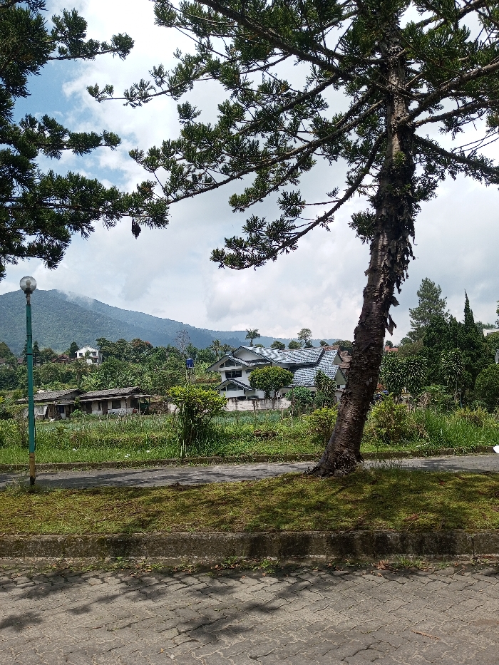 The image depicts an outdoor landscape within the city of Vieng Phouka, Laos, under a partly cloudy sky. The foreground features a grey interlocking paver surface, casting dappled shadows from overhead foliage. A narrow strip of green grass with a concrete curb separates this paved area from a more expansive grassy patch and cultivated ground. A large tree with a thick, textured, dark brown trunk and dense green coniferous foliage dominates the right side of the frame, with its branches extending into the upper corners. On the far left, a green pole supports a spherical streetlamp fixture. In the midground, beyond the grassy area, a series of structures are visible. To the left, several low-rise, older buildings with dark roofs appear nestled among dense vegetation. To the right, a more contemporary multi-story white building with a distinctive blue-grey tiled roof and multiple gables stands, surrounded by manicured shrubs. Further uphill in the background, another white building is partially discernible amidst a dense forest. The background is characterized by lush green, tree-covered mountains, with their upper reaches partially obscured by white clouds against a pale blue sky. No individuals or specific actions are observed within the scene.