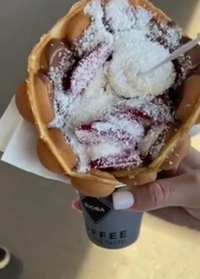 - "A hand holds a bubble waffle in a paper cone from the brand “RIOSA COFFEE THE TASTE!” The bubble waffle is topped with white powdered sugar, sliced strawberries, a white disc of something, and globs of chocolate sauce" by FM-JPbCw2, licensed under CC BY 4.0