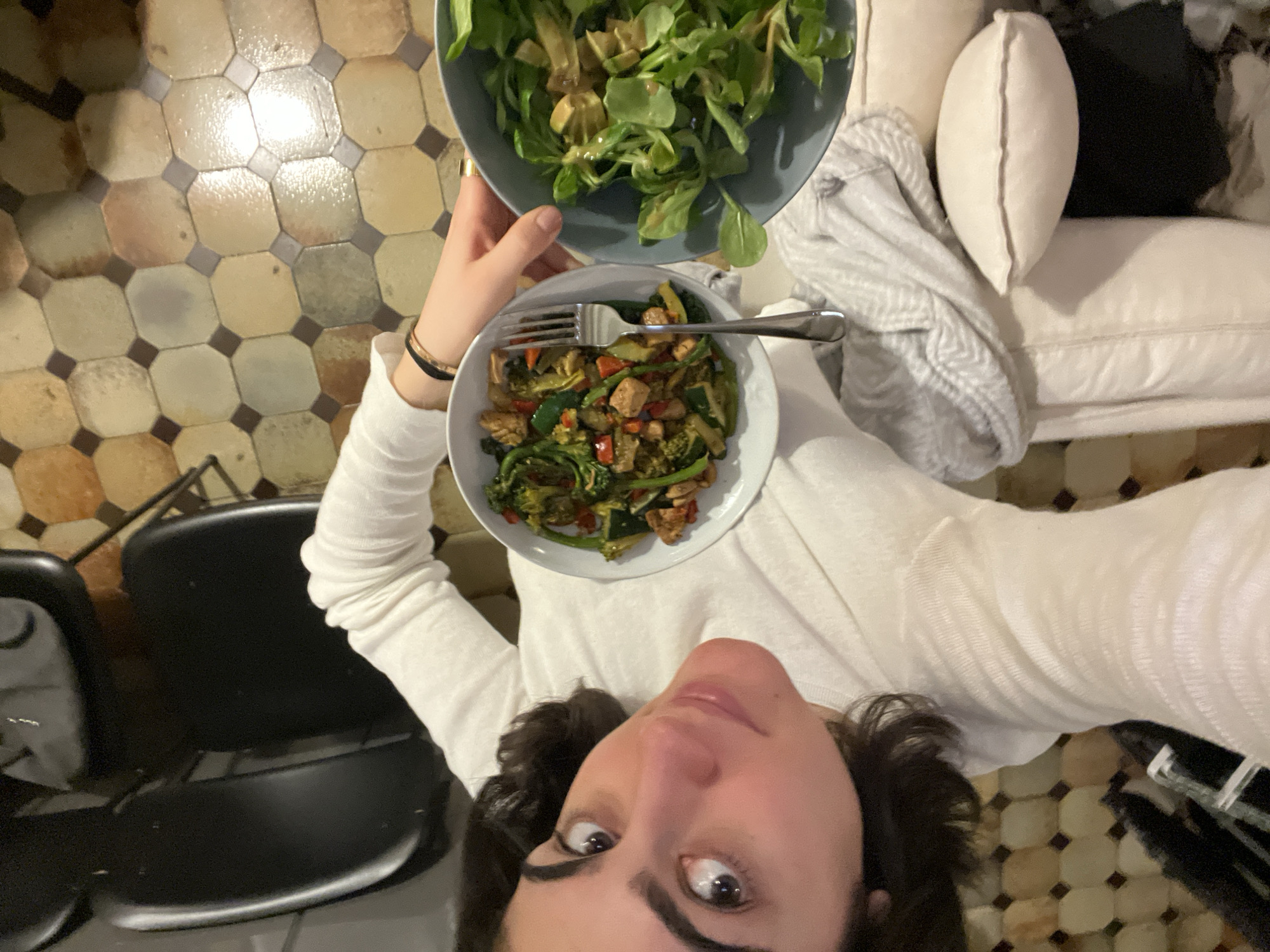 A woman holds two bowls of food in an indoor setting. One bowl contains a salad, and the other contains a mix of vegetables and what appears to be tofu or chicken. A fork rests on top of the second bowl. The woman is wearing a white long-sleeved shirt. In the background, there is a couch with pillows and a blanket, a black chair, and a tiled floor. The tiles are arranged in an octagonal pattern with contrasting colors. There is no explicit information suggesting this location is Paris, France.