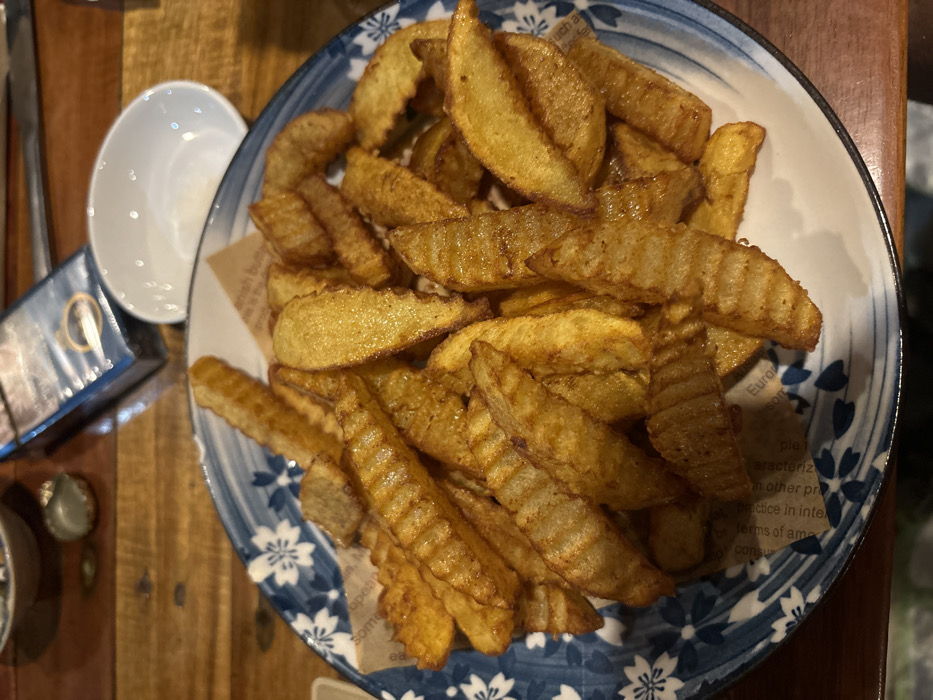 The scene depicts a close-up, overhead view of a meal served on a wooden plank table in Mai Chau, Vietnam. A white ceramic plate with a blue floral, cherry blossom-style pattern around its rim dominates the center. The plate contains a substantial serving of golden-brown fried potatoes, composed of both crinkle-cut fries and irregular wedge-cut fries, some exhibiting visible seasoning or spices. The fries are resting on a piece of light brown, grease-resistant paper printed with partial English text, including words like "Open to," "some," and "European." In the blurred background on the wooden table, a clear plastic-wrapped blue cigarette pack with a gold circular logo is visible towards the top right. Adjacent to the cigarette pack is a small, empty, white ceramic dipping bowl. Further to the left, a dark-colored, crimped bottle cap rests on the table, and a portion of another small dish is partially visible in the far upper left corner. No individuals or active interactions are depicted.
