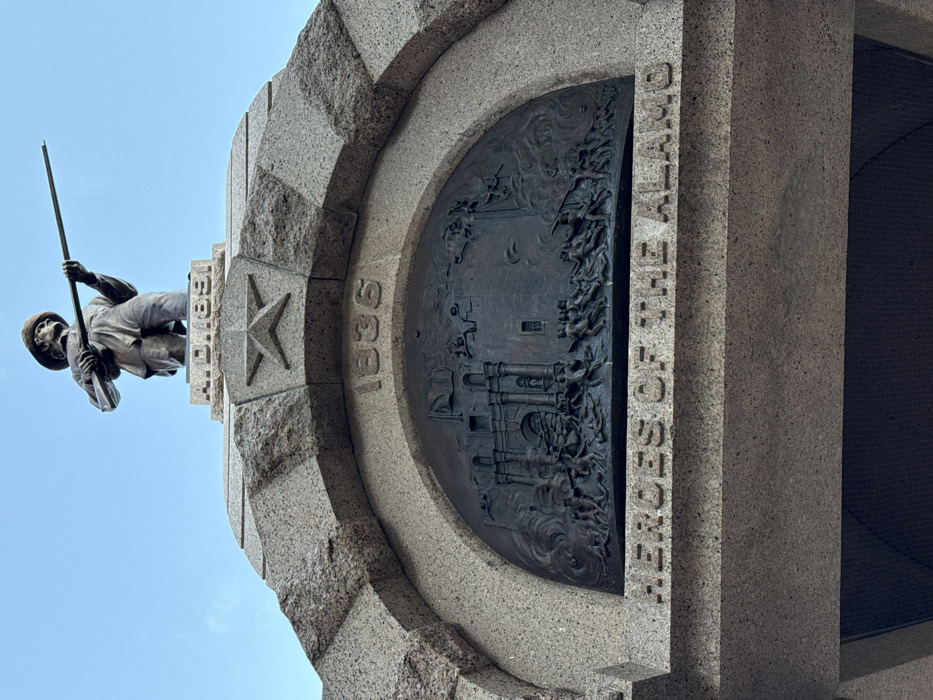 A monument features a soldier statue on top, holding a rifle against a blue sky. A five-pointed star and the number "1836" adorn the stone structure below. A circular bronze relief depicts a battle scene with a building resembling the Alamo. The vertical text "HEROES OF THE ALAMO" is inscribed on the side, emphasizing the monument's dedication.