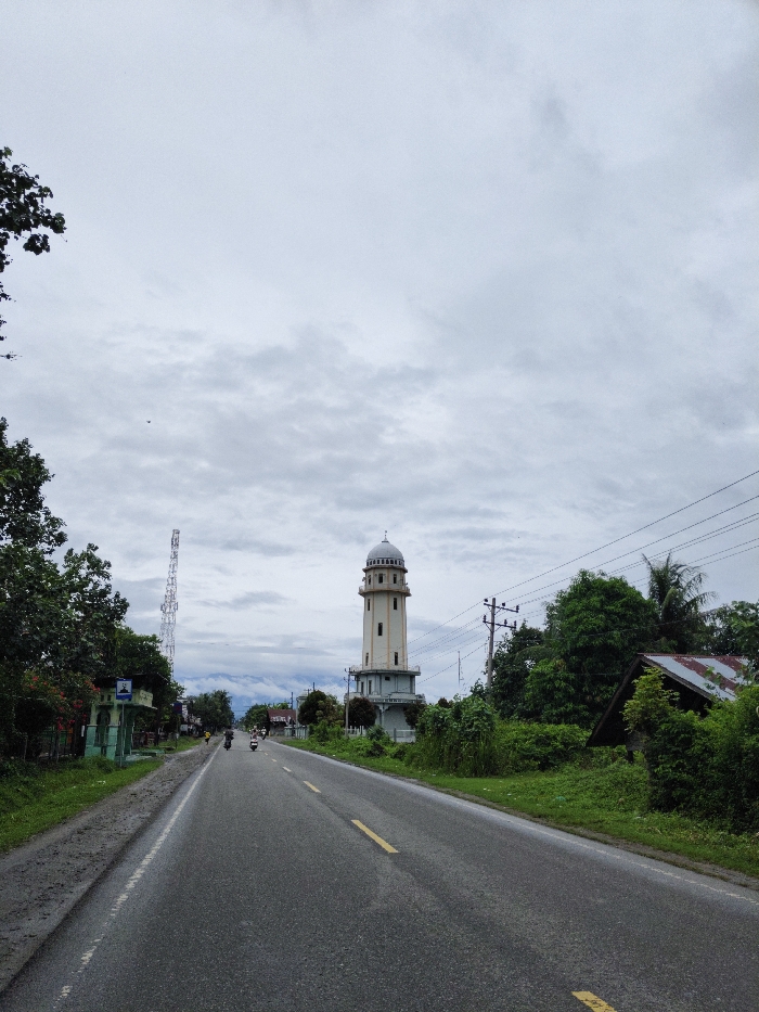 A straight road stretches into the distance beneath a cloudy sky. A tall, light-colored minaret with a dome stands prominently beside the road, contrasting with the surrounding greenery. Power lines crisscross the sky. Vehicles travel on the road. Lush vegetation lines both sides of the road, and a cell tower is visible in the background. The scene suggests a rural or suburban area, possibly in Southeast Asia.