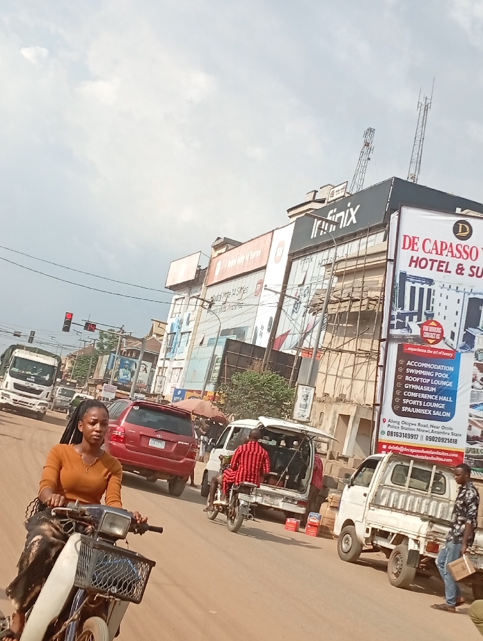 The image depicts a bustling street scene in Nnewi, Anambra State, Nigeria, specifically on Okigwe Road near the Orella Police Station, as indicated by a prominent billboard