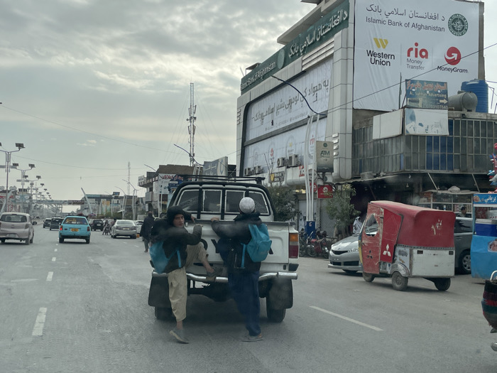 The scene depicts a multi-lane urban street in Kandahar, Afghanistan, under an overcast sky. In the immediate foreground, a white Toyota pickup truck is visible on the right side of the road, appearing to be stopped or moving slowly. Two male individuals are interacting with the rear of this truck. The individual on the left, wearing a dark jacket, light-colored pants, and a light blue backpack, has his left foot on the truck's rear bumper and is holding onto the truck bed with his left hand, appearing to be climbing aboard. The second individual, to his right, wears a dark jacket, dark pants, a white head covering, and a light blue backpack, and is positioned directly behind the truck, partially obscured. To the right of the pickup truck, a red, three-wheeled auto-rickshaw with "Mitsubishi" branding is present on the roadside. Vehicle traffic flows in both directions, with several cars, including a light-colored hatchback and a light blue sedan, visible in the lanes ahead. The road features white dashed lane markings. The right side of the image is dominated by a multi-story building identified by large banners as the "Islamic Bank of Afghanistan" (د افغانستان اسلامی بانک). The banners also display logos for Western Union, Ria Money Transfer, and MoneyGram. Below the bank, other commercial structures and an ATM sign are visible. Tall streetlights with multiple arms and antenna-like structures, along with a prominent cellular tower in the mid-ground, punctuate the urban landscape. Pedestrians are indistinctly visible on sidewalks near the buildings.