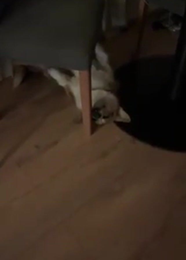 tan and white chihuahua-mix breed dog lying on its back underneath a gray chair. The dog is facing up at the camera. A hand comes into the frame and begins to pet the dog’s head. The setting appears to be inside a home with wood laminate flooring. A black table leg and black base of the table are also visible next to the chair.