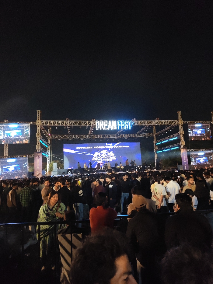 An outdoor music festival, "Dream Fest," is depicted at night within F-9 Park (Fatima Jinnah Park) in Islamabad, Pakistan. A large crowd of individuals, primarily young adults, occupies the foreground and midground, facing a brightly lit stage. The stage structure, constructed from metal trussing, features a prominent "DREAM FEST" sign illuminated in blue neon letters at its upper center. A large central LED screen displays "OFFICIAL YOGURT PARTNER" with abstract graphics, and several figures, possibly performers or event staff, are visible on the stage floor. Two smaller auxiliary LED screens flank the main stage, displaying similar concert visuals. Numerous stage lights and audio equipment are mounted on the trussing. The crowd, densely packed, extends from the immediate foreground towards the stage. A black metal barrier separates the closest attendees from the bulk of the audience. In the foreground, a woman wearing a light green printed shalwar kameez stands leaning against this barrier, looking towards the right. Another person in a red top is visible just behind the barrier in the center. The environment is dark, with the stage and surrounding lighting providing the primary illumination. No other specific structures or natural elements are distinctly visible beyond the crowd and stage setup.