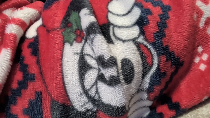 The image depicts a close-up view of a plush textile material, predominantly red, white, and dark blue. The central subject is a stylized, cartoon-like character with a white face, black eyes, black nose, and a black mouth indicating a smile, visually consistent with depictions of Mickey Mouse. The character is adorned with a red and white head covering, detailed with a green holly sprig and three red berries positioned on the upper left side of its head. The surrounding textile displays a red background patterned with dark blue zigzag designs. A section of red and white striped fabric is visible on the image's left edge. The fabric exhibits surface undulations consistent with soft material. No individuals, actions, or specific environmental features are present within the frame. The image provides no visual information to determine a location in the city of Venray, Netherlands.