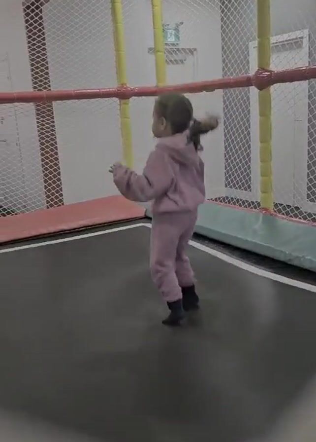 A young girl is jumping on a trampoline. She is wearing a mauve-colored sweatsuit and black socks. Her hair is in a ponytail. The trampoline is in an indoor playground with a net enclosure. There is padded material around the edge of the trampoline. Part of an indoor play structure is visible in the background.
