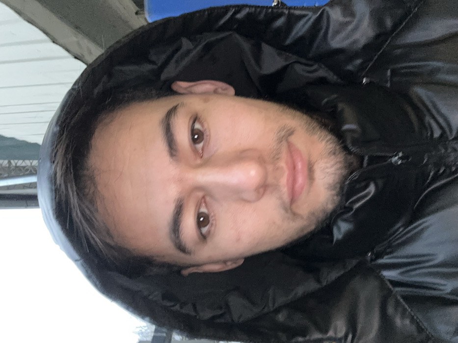 A young man with brown eyes and short, dark hair is centered in the frame. He has light skin and a slight stubble. The man is wearing a shiny, black hooded jacket, with the hood pulled up around his face. The background is partially obscured but appears to include a building or structure, possibly outdoors. The overall image has a casual, selfie-like feel.