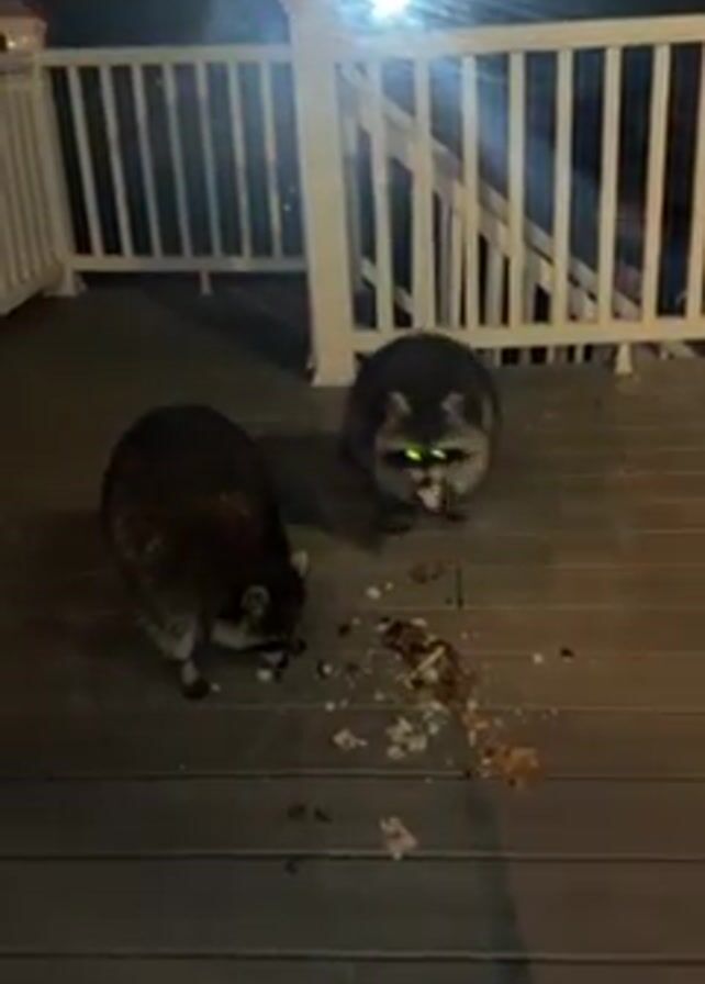 - "Two raccoons are eating discarded food remnants on a wooden deck" by FM-ownra2, licensed under CC BY 4.0