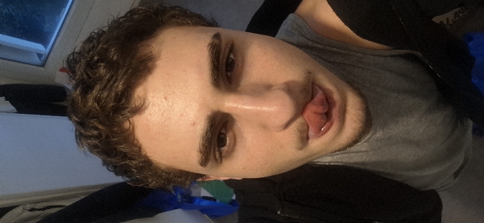 A selfie-style shot of a fair-skinned man with dark curly hair and bushy eyebrows. He is wearing a gray shirt with a black jacket. He is sticking his tongue out. The photo is taken at an odd angle, tilted to the side. The background features a window and some miscellaneous items.