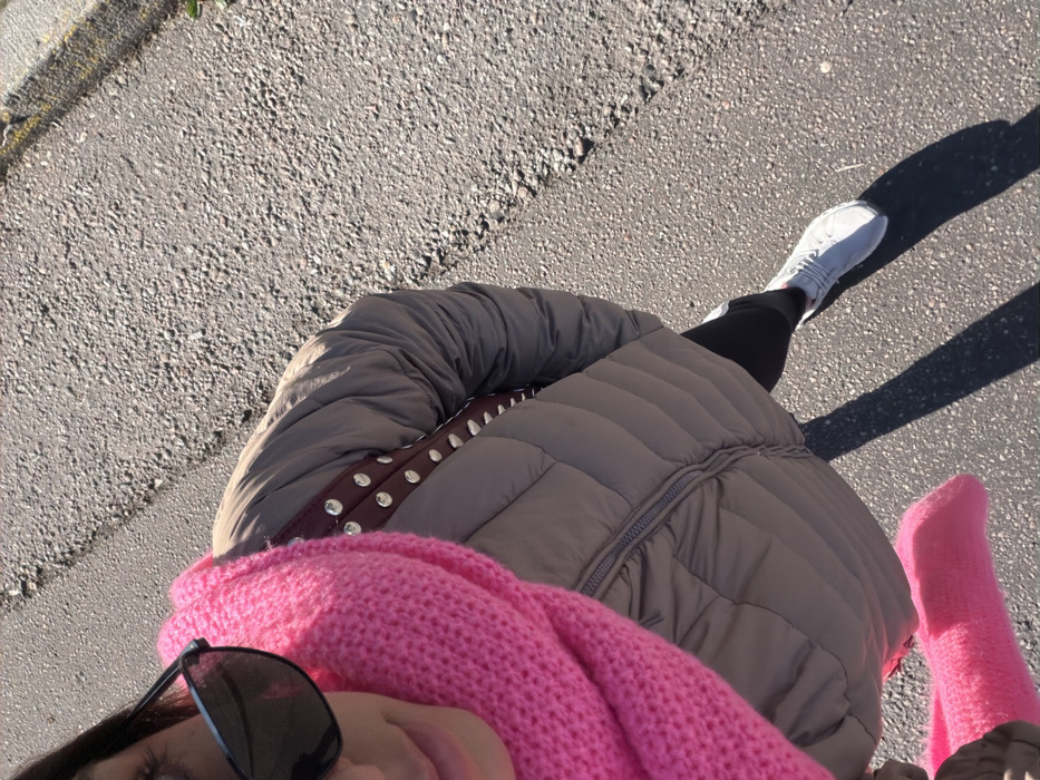 A high-angle outdoor image in Stockholm, Sweden, captures an individual from the upper torso to the feet, with the upper portion of their face obscured by dark sunglasses visible on the left. The person wears a bright neon pink chunky knit scarf, a beige quilted puffer jacket with a central zipper, black leggings, and white athletic shoes. A dark red strap adorned with silver studs, presumably from a bag, crosses the individual's left shoulder. The ground consists of a coarse, dark grey asphalt or gravel surface. A distinct concrete curb or edge is visible in the upper right quadrant. Bright sunlight casts elongated shadows of the individual onto the pavement, indicating a sunny environment.