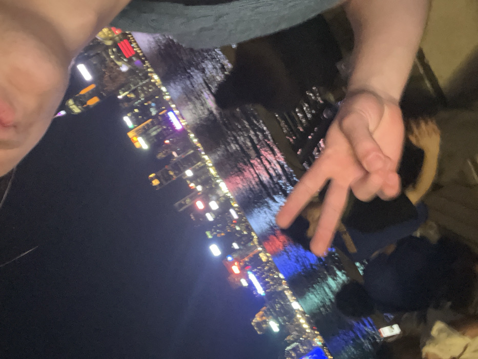 The image depicts a nighttime scene of Victoria Harbour, viewed from an unspecified location within Kowloon, China. The brightly illuminated Hong Kong Island skyline is visible across the water. In the immediate foreground, the lower right portion of a person's face, including the mouth and chin, is partially visible in the upper right quadrant. This individual's right hand, light-skinned and positioned in the lower center, displays a "V" gesture with the index and middle fingers extended. A dark garment covers the right shoulder and arm area of this person. To the left and below the extended hand, two blurred figures are present, partially obscuring the water and a dark railing. One figure, seen primarily from behind, wears a dark blue shirt and appears to hold a white, rectangular object, consistent with a mobile phone, in their left hand. The midground consists of the dark waters of Victoria Harbour, which reflect numerous distinct, multi-colored lights from the distant buildings. The background showcases a dense collection of high-rise buildings on Hong Kong Island, brightly lit with a variety of colored lights, predominantly red, blue, yellow, and white, contrasting against a dark night sky.