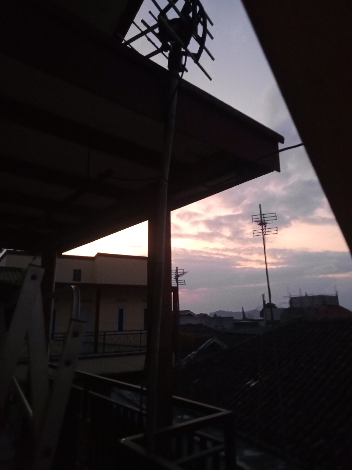 The image depicts a residential scene in Cimacan, Indonesia, captured during twilight hours, characterized by low light and prominent foreground silhouettes. A dark roof eave extends across the upper portion of the frame. Centrally, a vertical pole, likely constructed from bamboo, supports a television antenna, creating a distinct silhouette. To the immediate left, a portion of a white object, consistent with a ladder or a drying rack, is partially visible. A dark, angular metal railing occupies the lower foreground. In the midground, a two-story building with a light-colored facade, a balcony, and blue-colored window or door elements is visible. Below this, multiple dark-tiled residential rooftops are present. Several other pole-mounted television antennas extend above these rooftops. The background sky exhibits twilight coloration, with pink, purple, and pale orange hues near the horizon transitioning to a lighter blue with scattered clouds. Distant mountains are silhouetted against the horizon. No individuals, specific actions, or interactions are discernible within the frame.