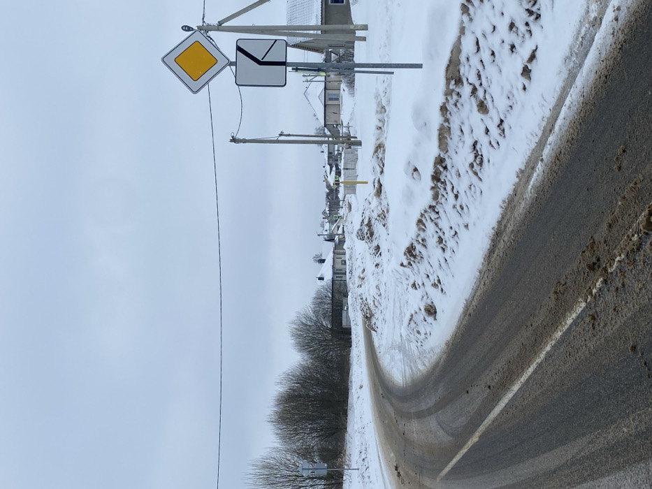 The image depicts a winter street scene in the city of Hlybokaye, Belarus, under an overcast sky. The foreground features a two-lane asphalt road curving to the left, partially covered with dirty slush and grit, revealing a faded white solid line on its left edge. Significant piles of dirty, brownish-white snow line both sides of the road. On the right side of the road, two traffic signs are mounted on a metal pole: an upper yellow diamond-shaped sign with a white border, signifying a main road, and a lower rectangular white sign with a black border depicting a black arrow curving left with a diverging right line. These signs are positioned near a wooden utility pole with overhead wires. In the midground, several bare deciduous trees or large bushes are visible on the left, behind the snowbank. Multiple single-story or two-story residential buildings with light-colored facades and snow-covered pitched roofs are distributed along the road's curve in the background, primarily on the right side. No individuals or active vehicles are present in the scene.