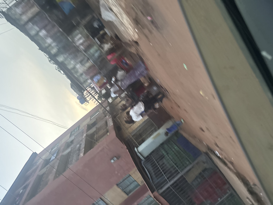 A slightly tilted image depicts a bustling street scene. Buildings line the left, including one with a pink facade and multiple stories. Street vendors and pedestrians crowd the narrow lane under a makeshift canopy, creating a lively marketplace atmosphere. The road appears dusty and worn. A blurred, reflective surface, possibly a window, frames the right side of the shot. Overhead, power lines crisscross the sky. The image suggests a vibrant, densely populated urban environment.