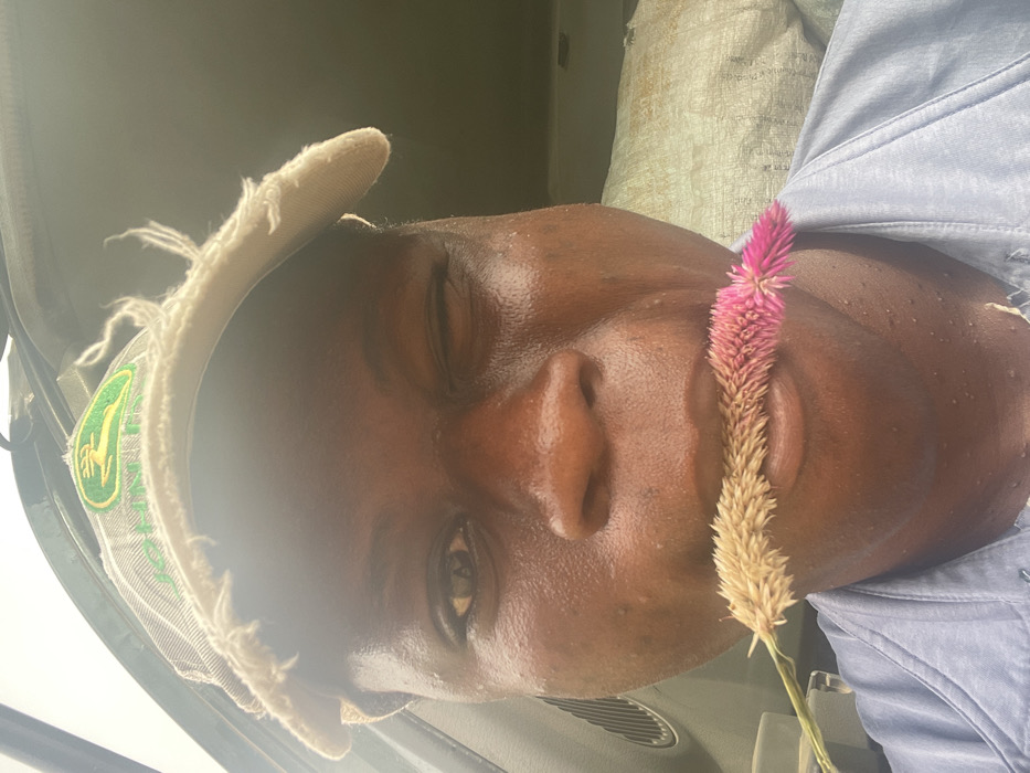 An adult male with dark skin is depicted in a close-up portrait, apparently seated inside a vehicle in Ikorodu, Nigeria. He wears a worn, light-colored baseball cap featuring a green and yellow John Deere logo on the front. His left eye is open, and his right eye is closed in a wink. A two-toned plant stem, with a light beige/tan section transitioning to a vibrant pink/magenta section, is held horizontally between his closed lips, mimicking a mustache. He is wearing a light blue collared shirt. The immediate background shows dark vehicle interior elements and, to the right, a large, light-colored, textured bag consistent with cargo.