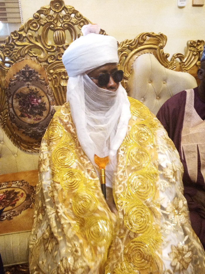 In Gawuna, Nigeria, a central individual is seated in an ornate, gilded armchair upholstered in cream fabric with floral rose patterns