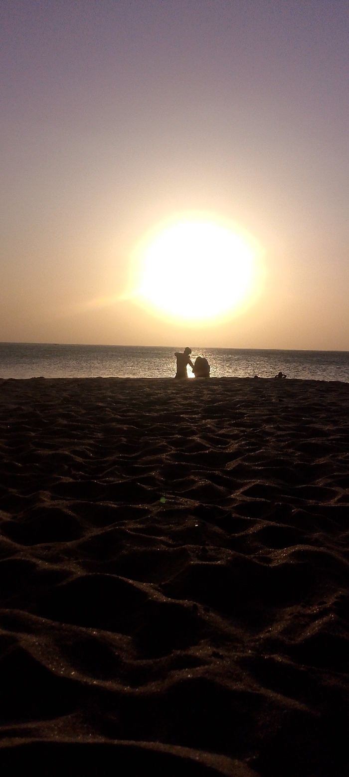This image depicts a beach scene in Juan Griego, Venezuela, during either sunrise or sunset