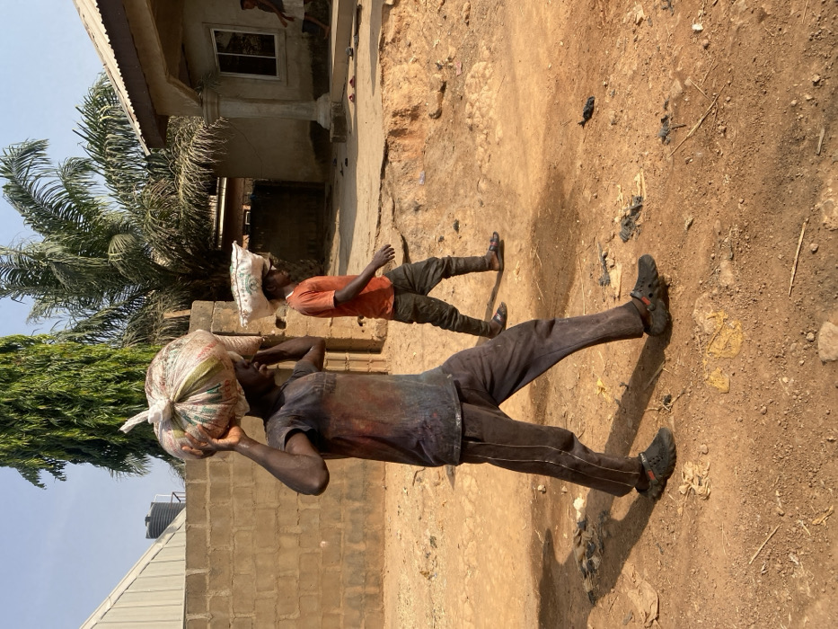 The image displays an unpaved, reddish-brown dirt thoroughfare in Rido, Nigeria, under clear daylight conditions. Two young adult males are prominently featured, walking from left to right while transporting goods. The lead individual, positioned in the foreground, wears a dark t-shirt with visible discoloration, dark trousers, and black clogs. He carries a large, light-colored woven sack, tied at the top, balanced on his head and steadied with both hands. His clothing and exposed skin appear soiled with dirt. The second individual walks behind and to the right of the first, wearing an orange t-shirt, dark trousers, and dark sandals. This individual carries a smaller, similarly tied, light-colored woven sack on their head. Their clothing also appears soiled. The immediate environment consists of uneven dirt ground with scattered dark debris and minimal dry vegetation. In the background, from left to right, a building with a corrugated metal roof and a black water tank is partially visible behind a low cinder block wall. To the right of the wall stands a single-story, light-colored concrete house with a corrugated metal roof, a visible window, and two front porch pillars. Several pairs of various sandals are scattered on the ground directly in front of this house. Tall green trees, including palm trees, are visible beyond the buildings. A third, partially obscured figure in light-colored attire is visible near the concrete house on the right side of the frame.