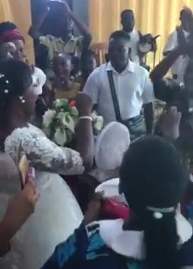 wedding celebration taking place indoors. A bride in a white wedding dress holds a bouquet and dances, surrounded by guests who are also dancing and celebrating. Many guests are taking photos or videos with their phones. There is a man with a white fan cooling the dancers. The room is decorated with yellow curtains and white flower arrangements. Music plays in the background.