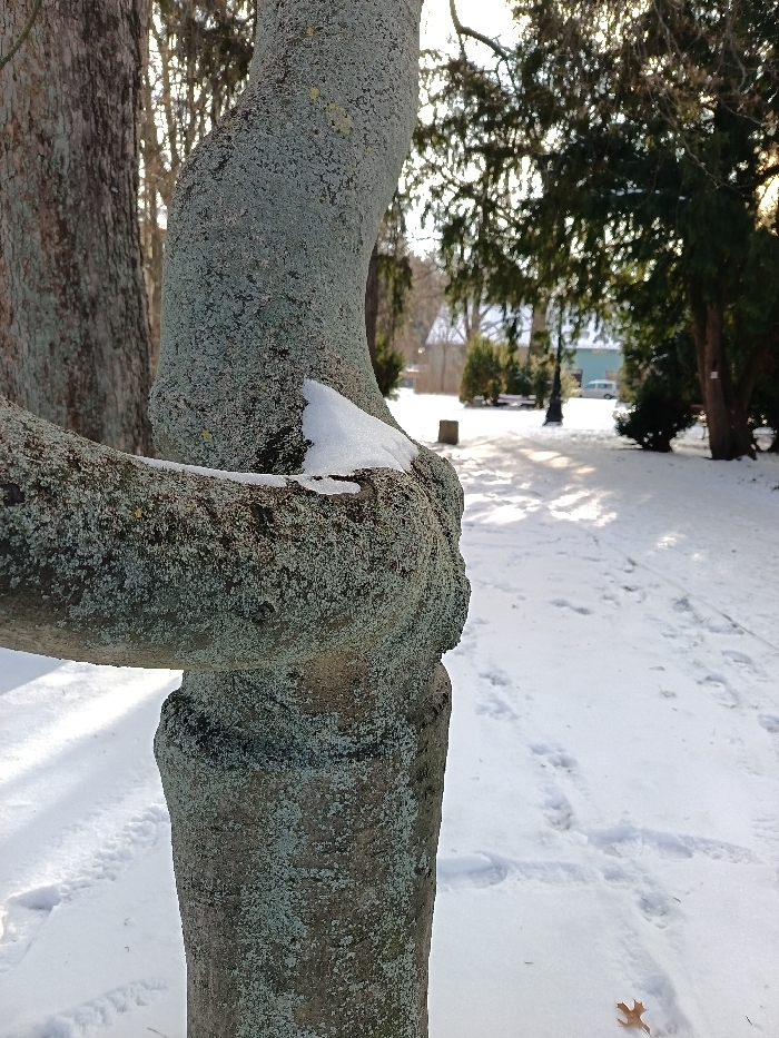 The image displays a snow-covered outdoor scene within Kamenz - Kamjenc, Germany, under bright sunlight. In the foreground, a substantial tree trunk and a thick, horizontally extending branch, both extensively covered in light grey-green lichen, occupy the left side of the frame. A distinct patch of white snow rests on the upper surface of the branch at its intersection with the trunk. To the right, a wide, snow-covered path or ground area extends into the background, marked with multiple human footprints. Sunlight from the upper right illuminates the snow, creating contrasting shadows. In the midground, a dark lamppost and a park bench are visible along the path. The background reveals a mix of bare deciduous trees and evergreen conifers, with several buildings and a light-colored vehicle partially discernible beyond them. No individuals are present, and no specific actions are in progress.
