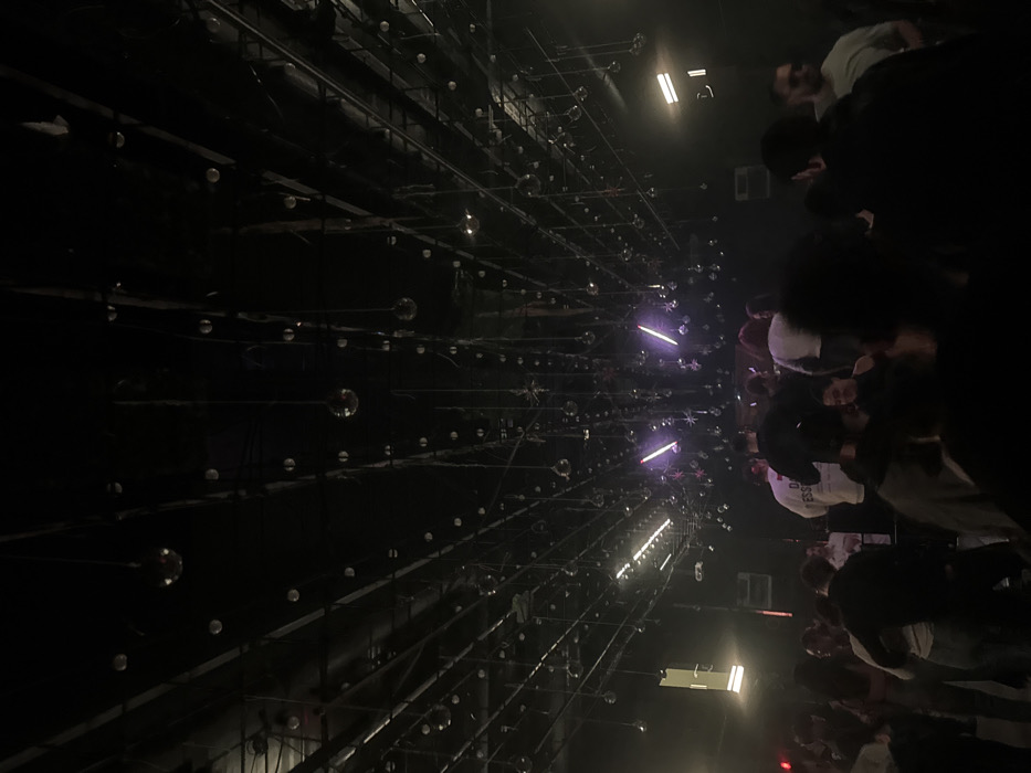 A dark, low-angle interior shot features rows of suspended clear spheres with linear support structures. Dim lights are interspersed among the spheres, creating a tunnel-like perspective. Silhouettes of people stand to the right, suggesting an event or exhibition space. The image has a hazy, atmospheric quality.