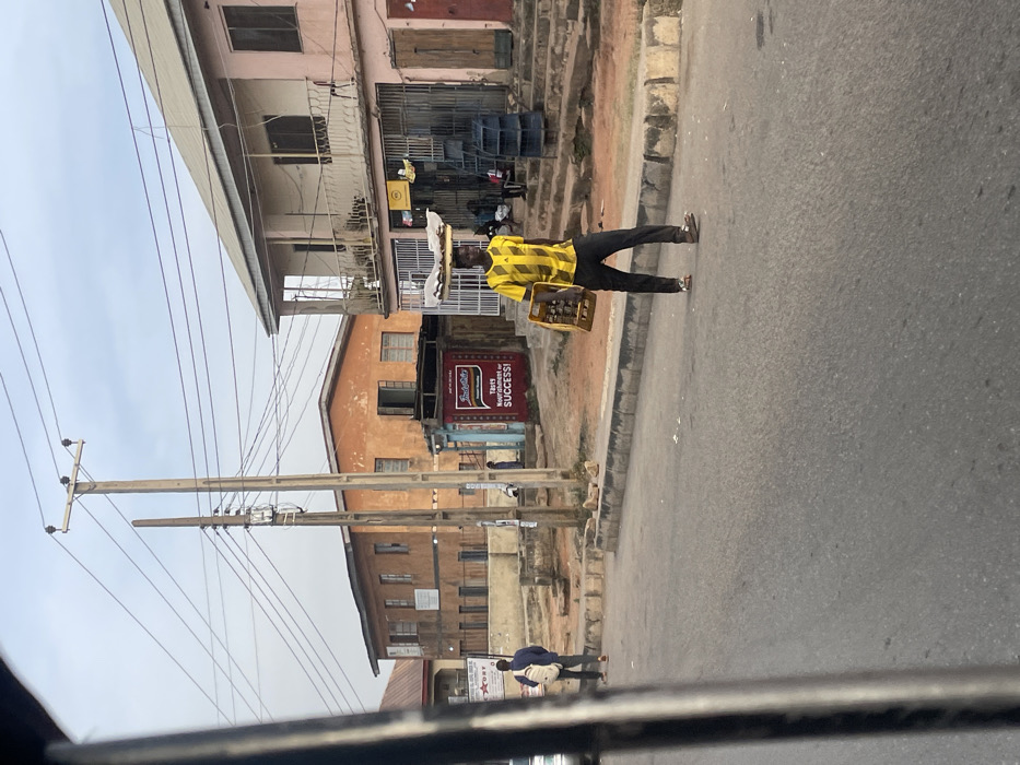 A man in a yellow and black striped shirt carries a crate of bottles in one hand and a white object on his head. He walks down a street with buildings lining both sides. There's an advertisement for "Tasty Treat" food product and another person walking further down the street. Power lines stretch across the sky, attached to wooden utility poles. The photo appears to have been taken from inside a vehicle.