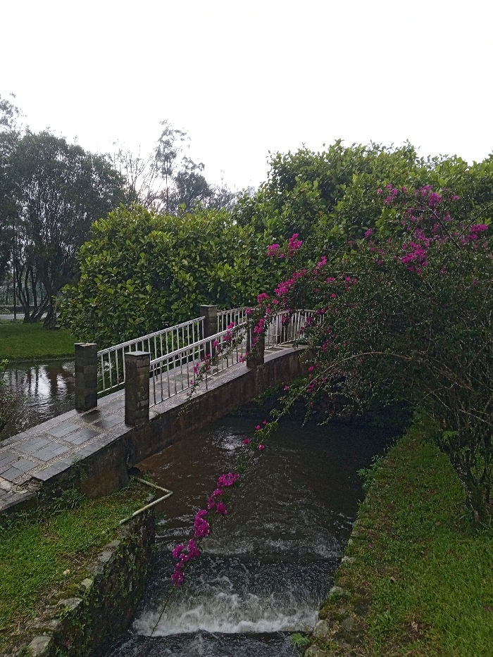 A small stone bridge spans a narrow stream, its surface wet and glistening. The bridge features a white railing and stone pillar supports. Lush greenery surrounds the stream, including bushes with vibrant pink flowers cascading over the bridge and water. The water flows swiftly downstream, creating a small waterfall effect. Trees and a muted sky are visible in the background.