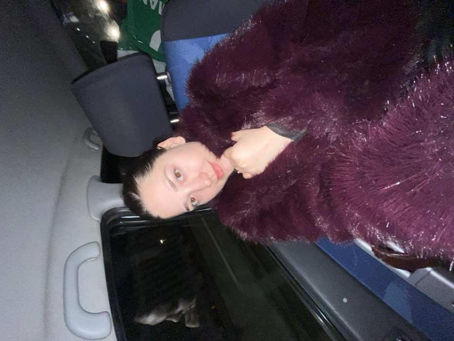 A woman with dark hair is reclining in a vehicle, wearing a large, fuzzy, dark burgundy jacket. Her face is close to the camera, and she is looking directly at the viewer with a slight smile. Her hand is near her chin. Behind her, there are other passengers and the vehicle's interior, including a headrest and a passenger assist handle. The window behind her reflects a dimly lit area. The overall lighting in the photo is somewhat dark.