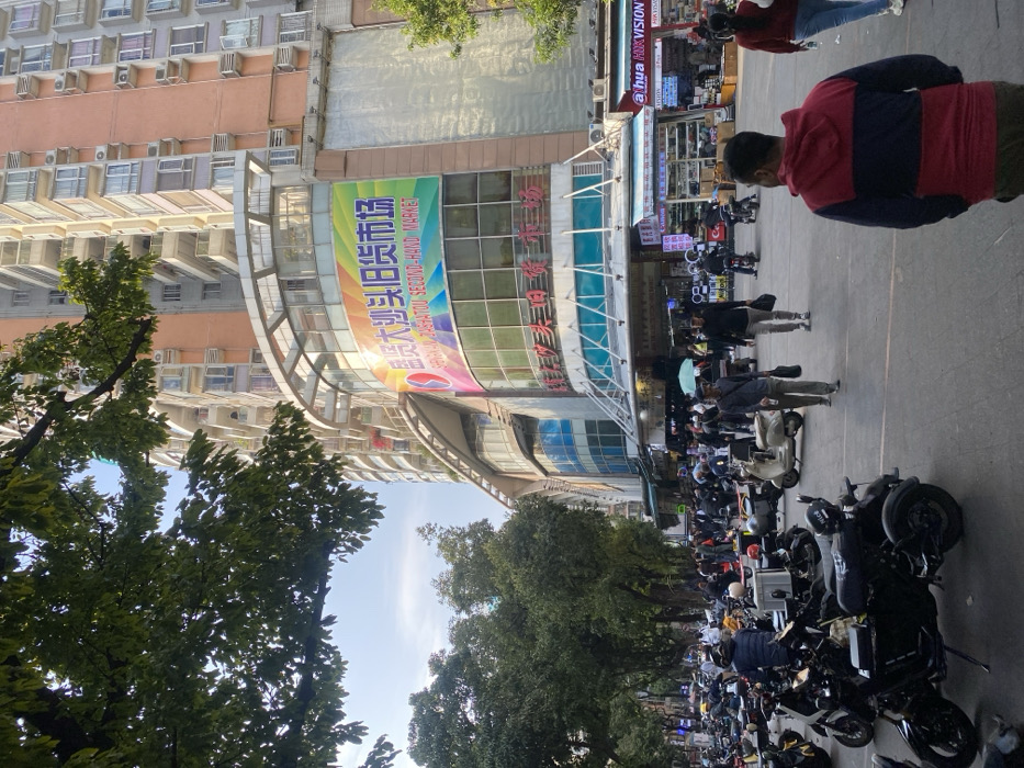 street scene in China. A building with a large banner advertising the "Sheng-TashaTou Second-Hand Market" dominates the frame. The street is crowded with parked motorbikes and scooters. People are walking along the sidewalk in front of the market. A building with many apartments is across the street. Trees line the street, with more buildings visible in the background, with shops indicated by a sign that says "Hua HIKVISION."