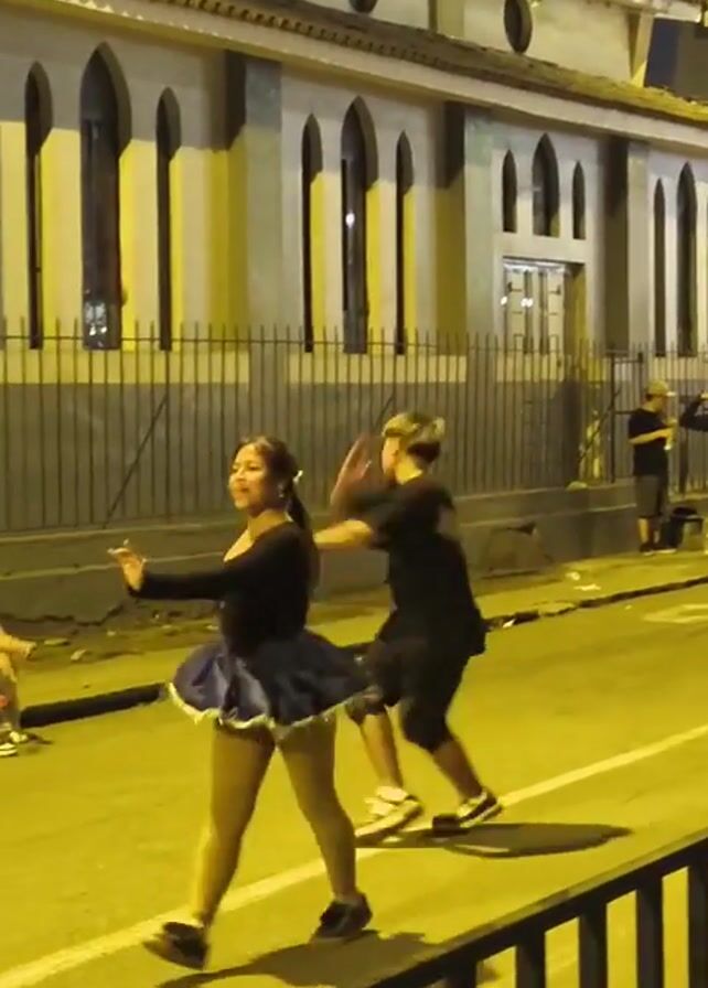 Two young people are dancing in the street. One is a woman wearing a black top, a blue skirt with a white trim, and flats. The other is a young man in a black T-shirt and black shorts with white sneakers. They are dancing in the middle of a street with a building on one side and a fence on the other. There are other people sitting and standing nearby, observing them. The scene is lit by streetlights, and it appears to be nighttime. There is music playing in the background.