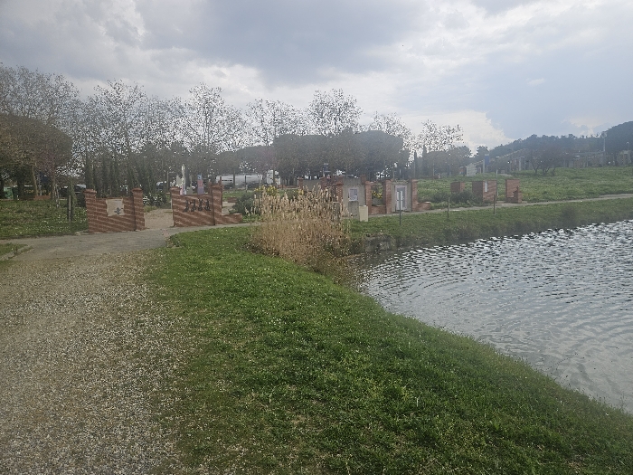 This image depicts an outdoor scene in Avignonet-Lauragais, France, under an overcast sky. The foreground on the left consists of a light-colored gravel path. To its right, a vibrant green grassy bank slopes down to a canal, whose surface exhibits ripples. In the mid-ground, a prominent brick-built archway is visible. The left side of this archway features a crest-like symbol integrated into its brickwork, while the right side displays the letters "JAI". To the right of the archway, along the canal bank, several small, individual brick structures are arranged. These structures resemble miniature building facades, some including distinct door-like or window-like openings. Patches of dry, tall reeds line the canal's edge in this area. The background is populated by numerous deciduous trees with minimal foliage, suggesting a period outside of full summer. Distant green hills and additional vegetation are visible under the diffused light of the cloudy sky. No individuals or specific activities are present within the scene.
