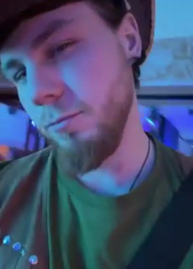 A medium close-up shot shows a person with fair skin, brown hair, and a beard, wearing a light green t-shirt, a brown fringed vest with reflective accents, a dark hat, and a black strap across their chest. The individual is looking directly at the camera with a slight frown. The background is blurred with blue and purple lighting and appears to be an indoor setting. There is the sound of music playing in the background.