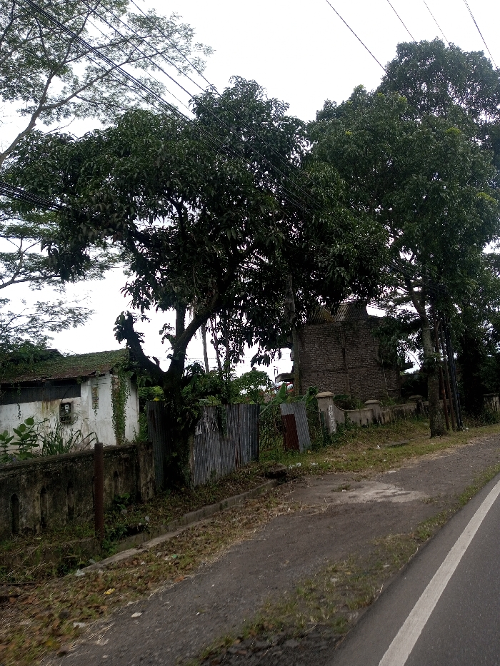 The scene depicts a rural or semi-urban roadside environment in Khajuripada, India, under an overcast sky. In the foreground, the edge of a paved road with a white solid line is visible on the right, bordering an unpaved shoulder of dirt and sparse dry vegetation. To the left, a low concrete wall, partially covered by overgrown weeds, runs parallel to the road. Behind this wall, a weathered corrugated metal fence, composed of multiple rusted zinc sheets, stands amidst dense green foliage. Further back on the left, a dilapidated, single-story white building features a corrugated metal roof heavily covered in green vines. An electricity meter box is affixed to its exterior wall, and a small, darkened window or opening is present. To the right of this structure, a large, gnarled tree with substantial foliage dominates the midground, its trunk showing evidence of pruning. Behind the trees and the corrugated fence, a two-story structure constructed of dark brick or stone is partially visible, appearing to be in disrepair or unfinished. Multiple utility poles, supporting an array of black electrical and communication wires, extend vertically behind the trees and across the upper portion of the frame. No individuals or active subjects are present.