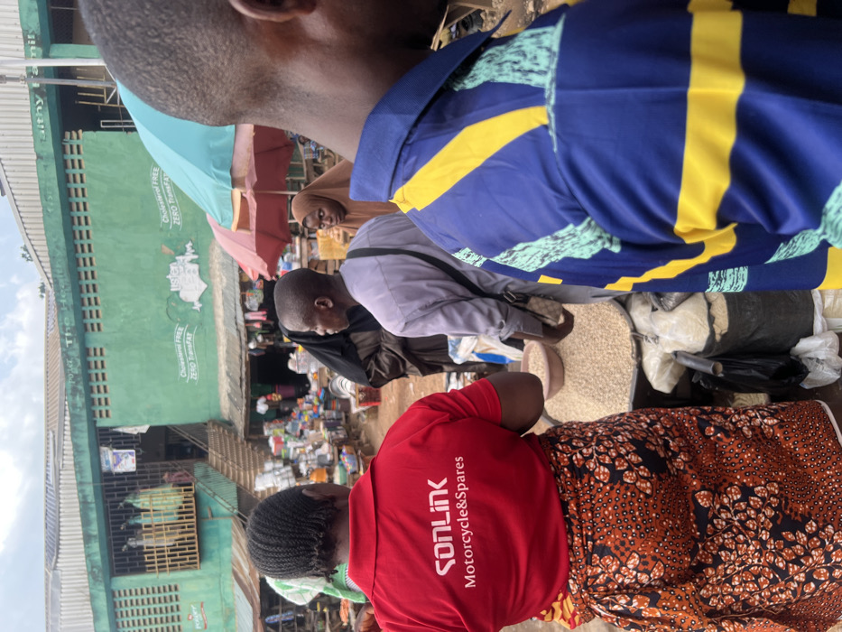bustling market scene in Ondo, Nigeria. The location is near the intersection of Igbatoro Street and Oyemekun Road, in the heart of the city. The image captures a diverse group of people in the market, with a focus on a woman wearing a red shirt with the inscription "SONLINK Motorcycle & Spares." She is standing near a pile of white grains, likely beans, contained in a large bowl. Her attention is directed towards the grain. Behind her is a young man in a grey shirt. He is looking towards the camera, carrying a black bag on his left shoulder. Further back, a woman is wearing a black hijab and holding a small brown bag in her right hand. To the right of the image, the back of a man wearing a blue and yellow striped shirt is facing the camera. The image shows a vibrant atmosphere, with numerous individuals interacting, and various goods being sold. The background showcases a green-colored building with a large green awning, as well as several shops and a staircase leading up to the second level. There are numerous other people, objects, and goods being sold in the market, suggesting a bustling commercial environment. The overall ambiance is a mix of everyday life and commerce.