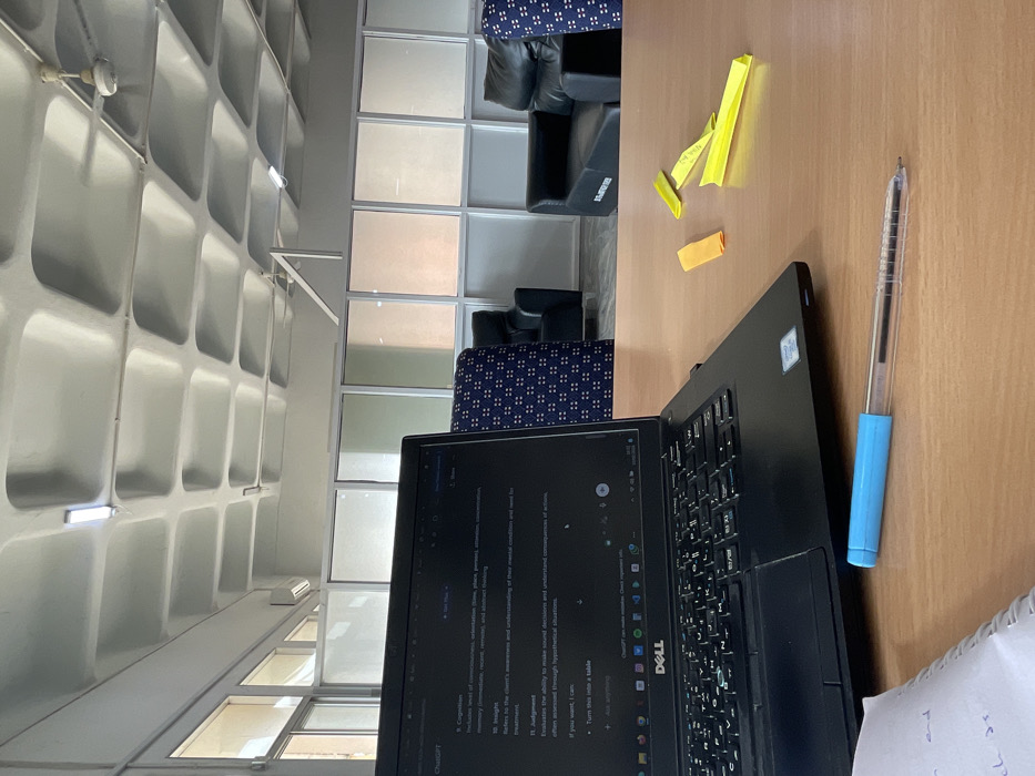 The image presents an interior view of a study or common area in Jos, Nigeria. In the foreground, a light-toned wooden table features a black Dell laptop open on the left. The laptop screen displays a ChatGPT interface with text related to "Cognition," "Insight," and "Judgment." To the right of the laptop, a transparent ballpoint pen with a blue cap and grip lies horizontally. A white notebook with handwritten text is partially visible in the bottom left corner. Scattered on the table to the right are several small, folded pieces of paper, predominantly yellow, with one orange. The background reveals a spacious room with a white, coffered ceiling equipped with rectangular fluorescent light fixtures and at least two ceiling fans. The perimeter walls consist of large, framed glass partitions, some appearing frosted or tinted, allowing ambient light. Beyond these partitions, a seating area is visible, furnished with multiple dark-colored armchairs or small sofas, some accented with blue and white patterned fabric on their backrests. An air conditioning unit is mounted high on the left wall. No individuals are present in the scene.