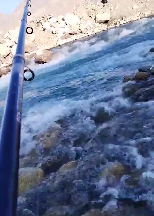 close-up, first-person perspective of a fishing rod against the backdrop of a rapidly flowing river. The fishing rod is dark blue and has several guides along its length. The river is turquoise blue and white with whitewater rapids and flows over and around numerous rocks and stones. The shoreline is rocky and mountainous, with large boulders and sparse vegetation. The sky is a clear blue.