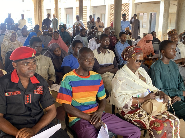 The image depicts a public gathering inside a light-colored building or open structure in Hayin Banki, Nigeria. Approximately 50-70 individuals, a mix of adult males and females, are present, mostly seated and facing forward. In the immediate foreground, from left to right: 1. A dark-skinned male, wearing a black uniform shirt with red trim, a red beret, and badges. The uniform features "UG. NWACHI" on the right chest, "NSCDC" on the left chest, and three vertically stacked red rhomboids below it. He holds white papers with both hands and looks slightly to his right. 2. A dark-skinned male, wearing a multi-colored horizontal striped t-shirt (red, orange, yellow, green, blue) and dark purple trousers. He sits with his hands in his lap, looking forward attentively. 3. A dark-skinned female, wearing eyeglasses, a patterned brown and white headwrap, a light cream-colored shawl draped over her shoulders, and a patterned brown, red, and white dress. She holds a pen in her right hand and is writing on a white paper or notebook resting on her lap. A light brown handbag with a gold chain strap rests beside her on the seat. She is also looking forward. The background shows a densely packed audience, with individuals dressed in various traditional Nigerian garments such as kaftans, hijabs, and patterned dresses, alongside some in Western-style shirts. Some individuals stand further back, near light-colored pillars and walls. The overall lighting suggests natural daylight conditions. No specific interactions between individuals in the foreground are observable, and the collective action is attentive observation of a central point not visible within the frame.